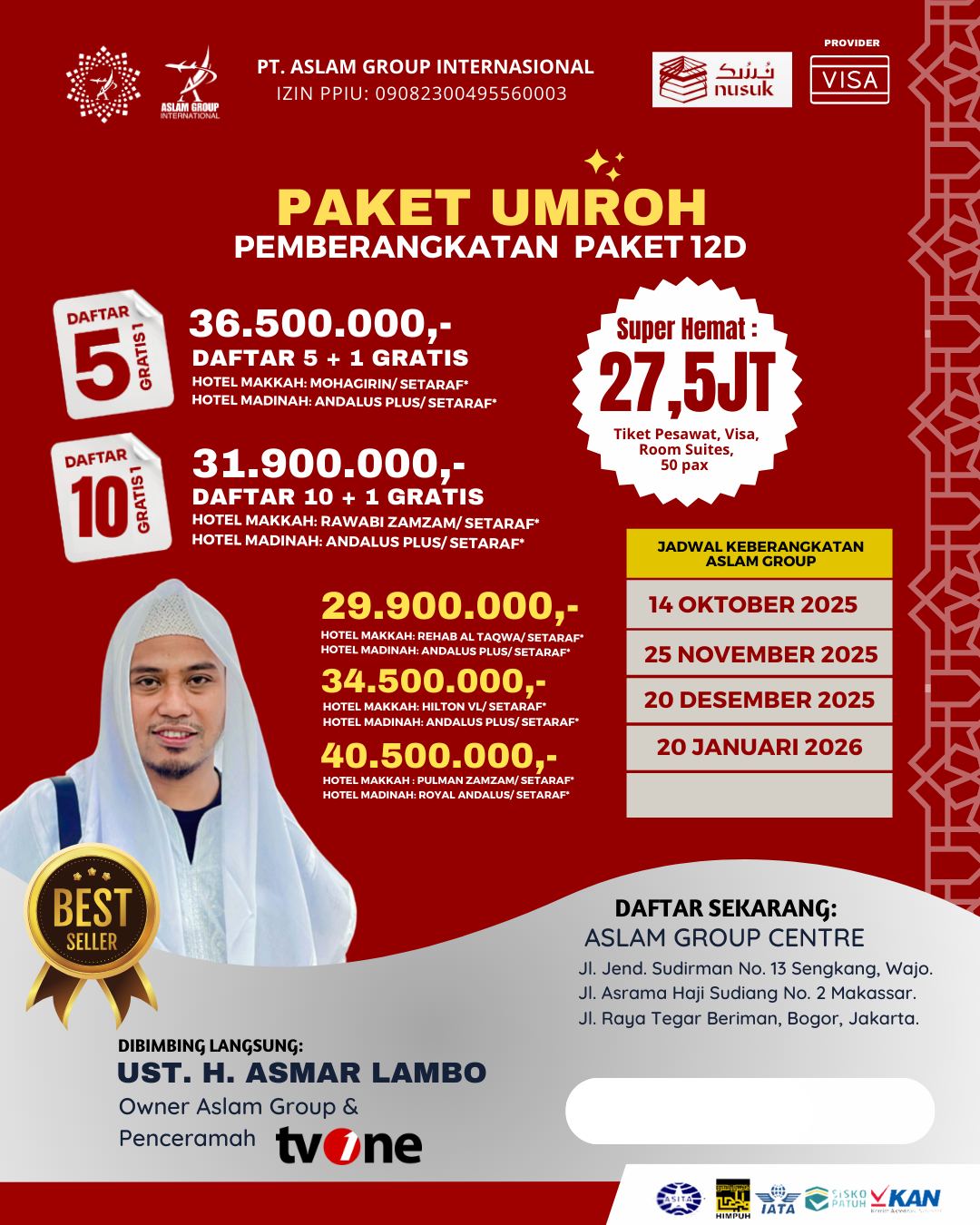 saya telah mendapatkan kesaksian salah satu jamaah wati bertutur bahwa kami sekeluarga sudah 3 tahun membersamai aslam group, kami sekeluarga setiap tahun berumrah lewat aslam group, dan jamaah haji plus pun kami percayakan keluarga kami diaslam group, karena pelayanan yang baik, sehingga kami tidak tergoda untuk pindah ke travel lain.